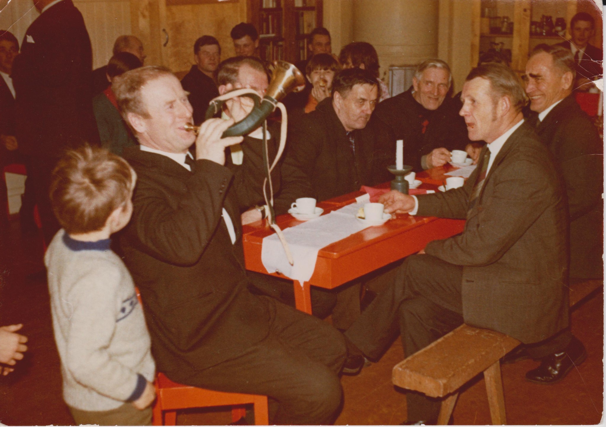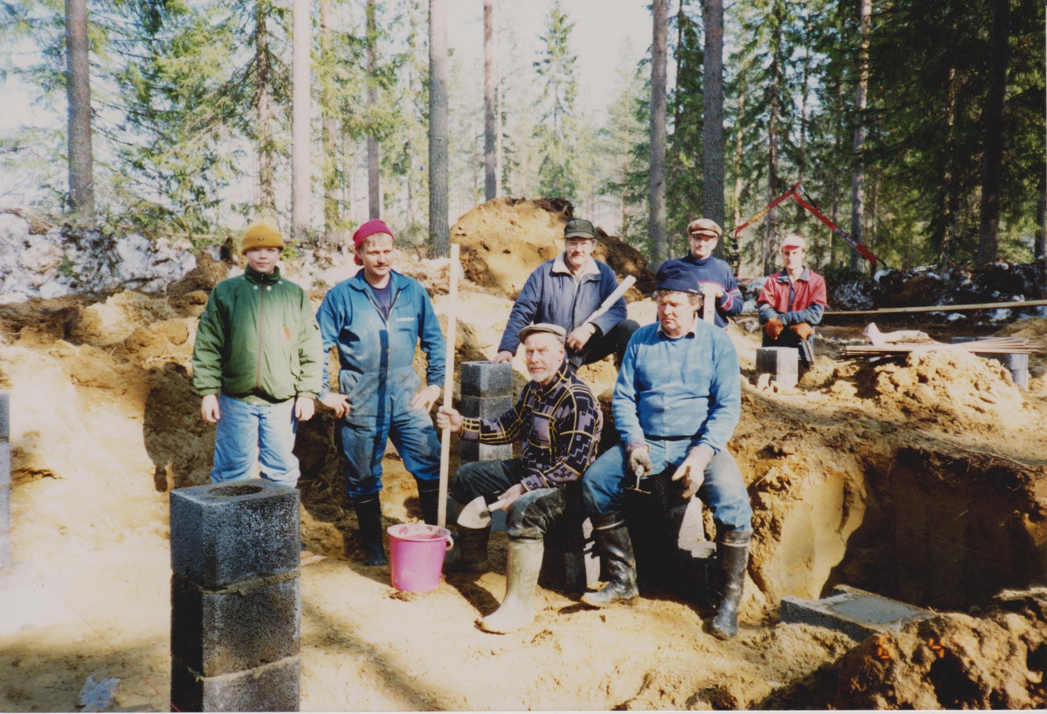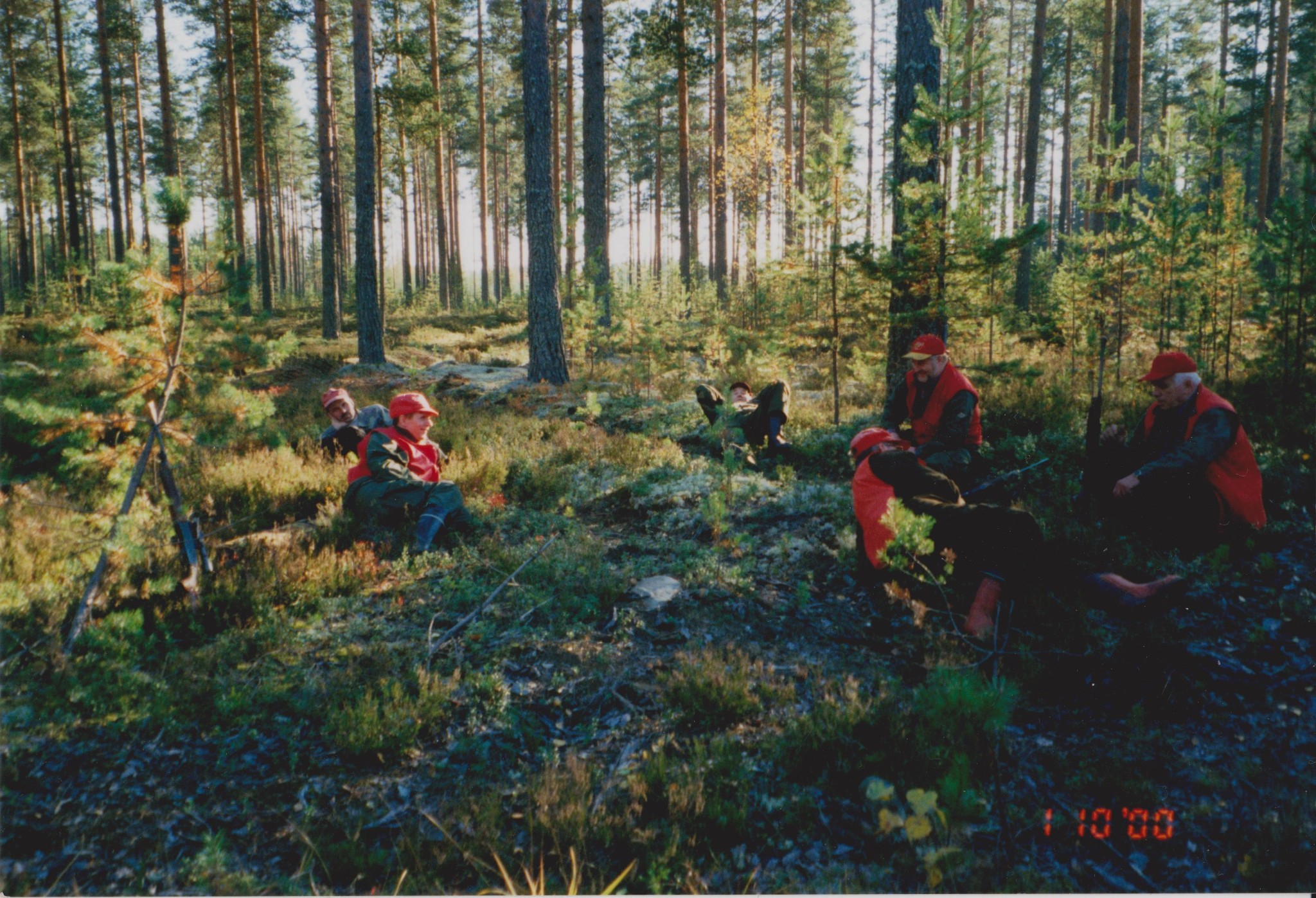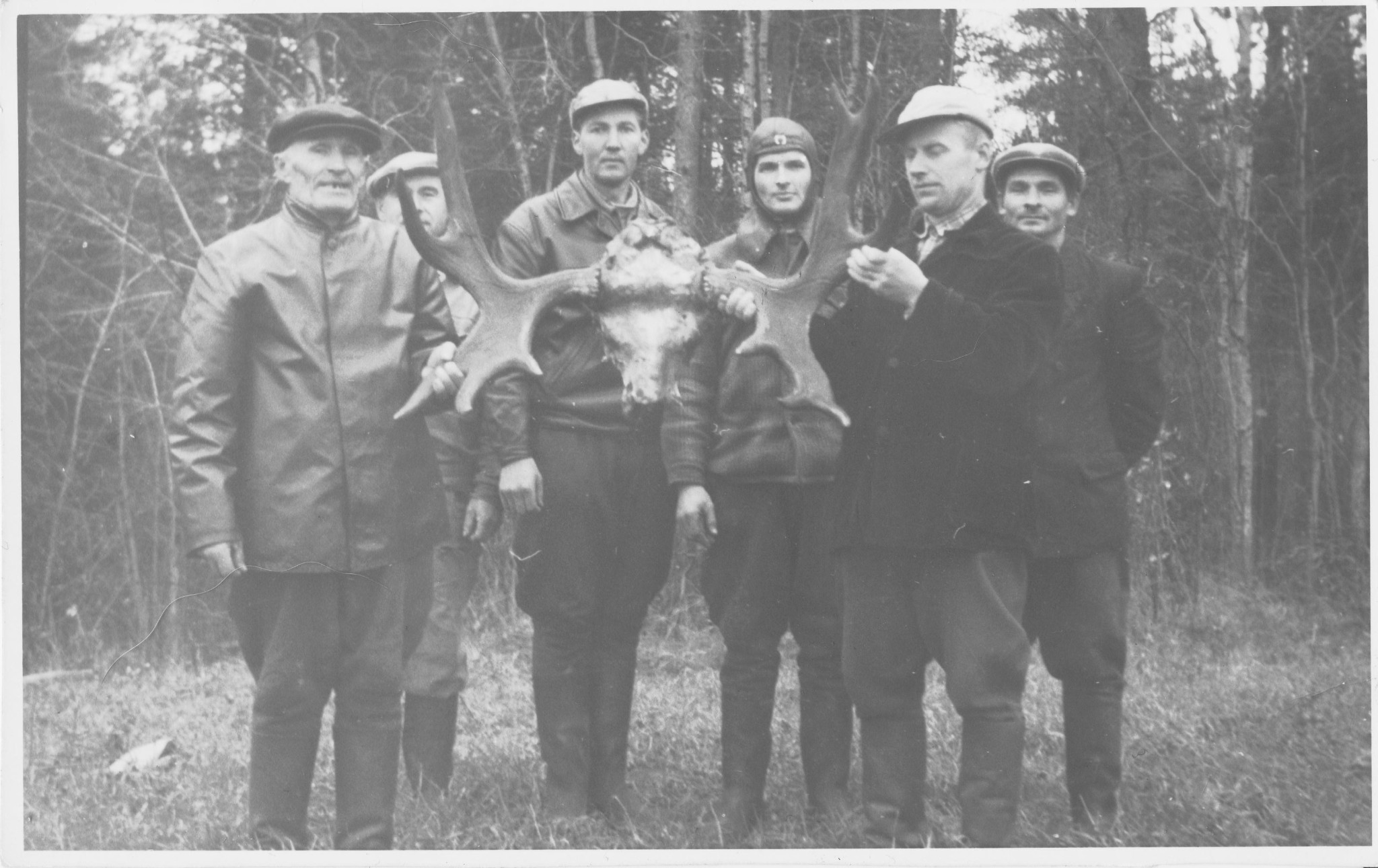 Vuosi 1958. Kuvassa jahtimiehet vasemmalta Herman Miinalainen, Leo Ohvanainen, Teuvo Eronen, Erkki Könönen, Matti Haaranen ja Toimi Huhtilainen.